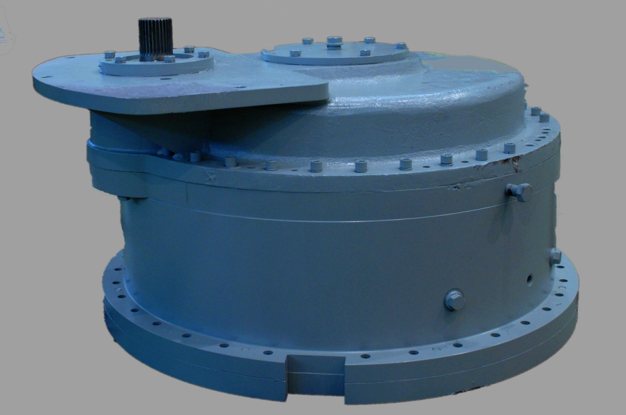 行走減速機(jī)安裝在履帶架上,由電機(jī)牽引驅(qū)動(dòng)挖掘機(jī)的走行;回轉(zhuǎn)減速機(jī)安裝在回轉(zhuǎn)平臺(tái)上,為行星結(jié)構(gòu)一級(jí)減速機(jī),電機(jī)驅(qū)動(dòng)減速機(jī),減速機(jī)輸出軸通過聯(lián)接回轉(zhuǎn)立軸齒輪與回轉(zhuǎn)大齒圈嚙合,實(shí)現(xiàn)挖掘機(jī)的回轉(zhuǎn)運(yùn)動(dòng);提升減速機(jī)為挖掘機(jī)提升機(jī)構(gòu)的主傳動(dòng)設(shè)備,用于驅(qū)動(dòng)提升卷筒;推壓減速機(jī)位于起重臂上,減速機(jī)輸出軸聯(lián)接小齒輪與斗桿齒條嚙合,驅(qū)動(dòng)齒條左往復(fù)運(yùn)動(dòng),與提升機(jī)構(gòu)一起工作實(shí)現(xiàn)鏟斗挖掘作業(yè)。