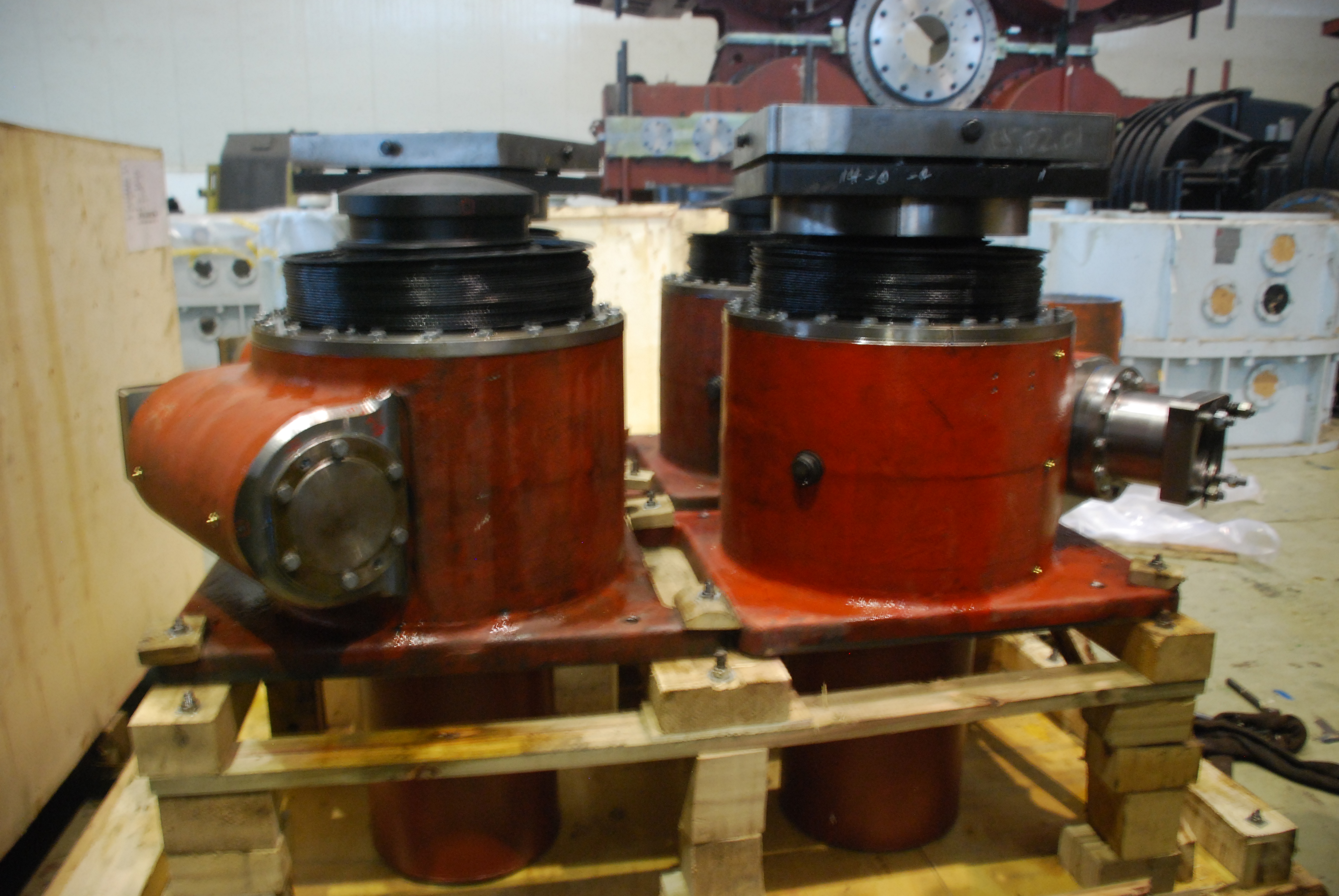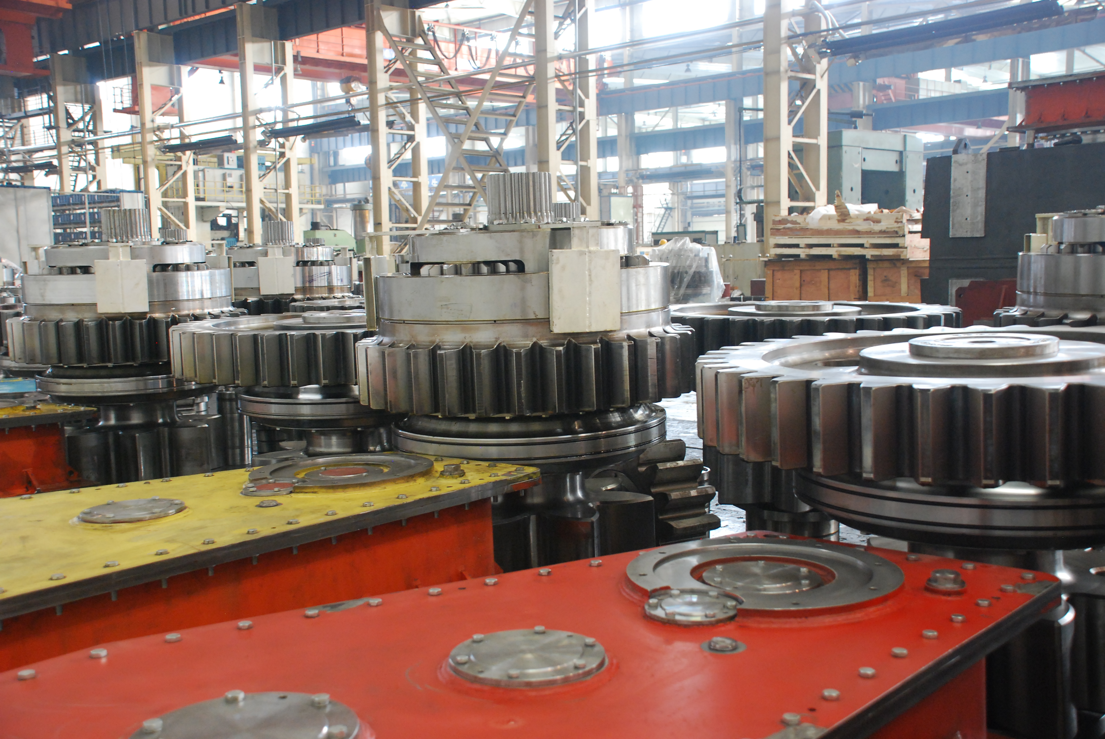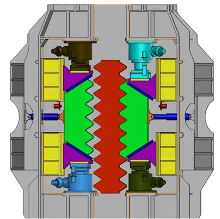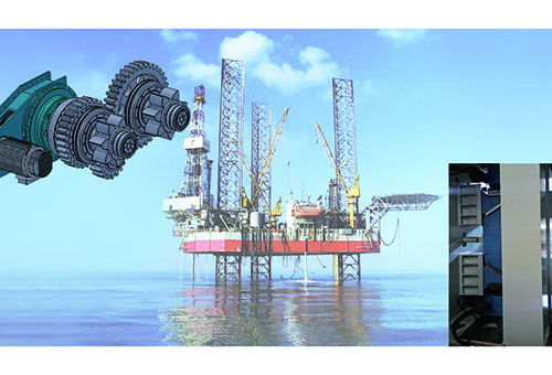 一臺驅(qū)動電機(jī)帶動兩個輸出爬升齒輪運(yùn)轉(zhuǎn),全封閉齒輪箱經(jīng)多級減速,最終實(shí)現(xiàn)大模數(shù)爬升齒輪帶動樁腿/平臺的抬升和下降。具有傳動速比大、自動均載、結(jié)構(gòu)緊湊重量輕、安全可靠性高、壽命長的特點(diǎn)。