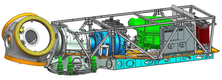 在國內(nèi)較早提出并應(yīng)用發(fā)電系統(tǒng)(發(fā)電機(jī)、變流器、干式升壓變壓器)上置技術(shù),集成電氣系統(tǒng)、冷卻系統(tǒng),機(jī)械承載結(jié)構(gòu)與動(dòng)力學(xué)分析。具有電纜數(shù)量少、易施工、塔內(nèi)線損少等優(yōu)勢(shì),免除箱變土建,減少整機(jī)和風(fēng)電場(chǎng)綜合成本。