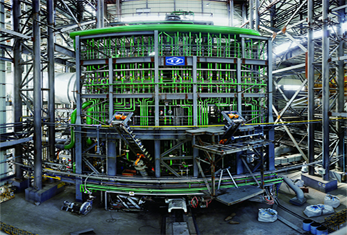 是一種熔融還原煉鐵裝置。該設(shè)備包含的部分有筒體、渣區(qū)冷卻壁和前置爐。筒體包含爐體段和煤氣室,直段直徑為Φ9280mm。煤氣室直徑為Φ5260