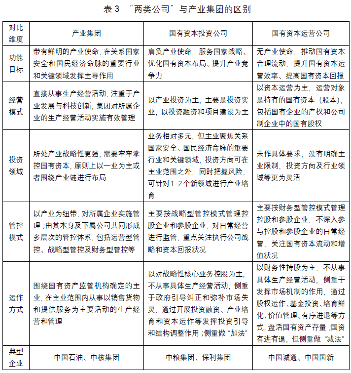 具體而言,“兩類公司”與產(chǎn)業(yè)集團(tuán)在功能目標(biāo)、經(jīng)營(yíng)模式、投資領(lǐng)域、管控模式、運(yùn)作方式等方面存在著區(qū)別(見表3)。