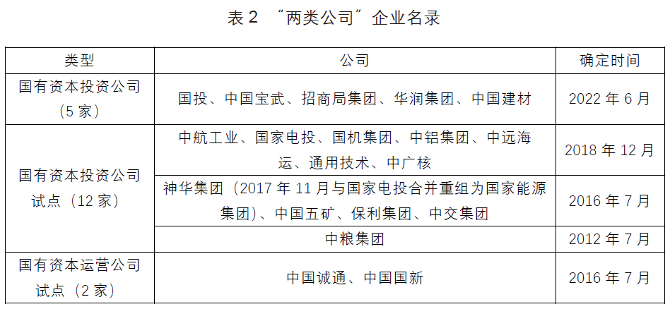 黨的十九大以后,以“管資本”為主線的國(guó)企改革進(jìn)一步提速,政策指引日益清晰。《關(guān)于推進(jìn)國(guó)有資本投資、運(yùn)營(yíng)公司改革試點(diǎn)的實(shí)施意見》從功能定位、組建方式、授權(quán)模式、治理結(jié)構(gòu)、運(yùn)行模式和監(jiān)督約束機(jī)制等對(duì)“兩類公司”進(jìn)行了明確的定義與規(guī)范。自2014年起,共有21家央企分三批參與國(guó)有資本投資、運(yùn)營(yíng)公司試點(diǎn)。目前,“兩類公司”形成5家轉(zhuǎn)正國(guó)有資本投資公司、12家試點(diǎn)國(guó)有資本投資公司、2家國(guó)有資本運(yùn)營(yíng)公司的“5+12+2”格局(見表2)。