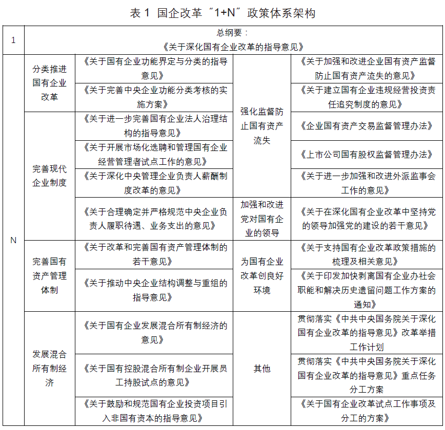 黨的十八大提出全面深化市場(chǎng)經(jīng)濟(jì)體制改革,完善各類國(guó)有資產(chǎn)管理體制。黨的十八屆三中全會(huì)通過的《關(guān)于全面深化改革若干重大問題的決定》首次提出“國(guó)有資本投資、運(yùn)營(yíng)公司”概念,為國(guó)有資產(chǎn)管理體制改革定下“管資本”導(dǎo)向。2015年,黨中央、國(guó)務(wù)院印發(fā)綱領(lǐng)性文件《關(guān)于深化國(guó)有企業(yè)改革的指導(dǎo)意見》,并在隨后出臺(tái)了22個(gè)配套文件,從總體要求到分類改革、完善現(xiàn)代企業(yè)制度和國(guó)資管理體制、發(fā)展混合所有制經(jīng)濟(jì)、強(qiáng)化監(jiān)督防止國(guó)有資產(chǎn)流失等方面,提出了國(guó)企改革的目標(biāo)和舉措,形成了“1+N”系列指導(dǎo)方案,為新時(shí)代國(guó)企改革搭建了“四梁八柱”(見表1)。