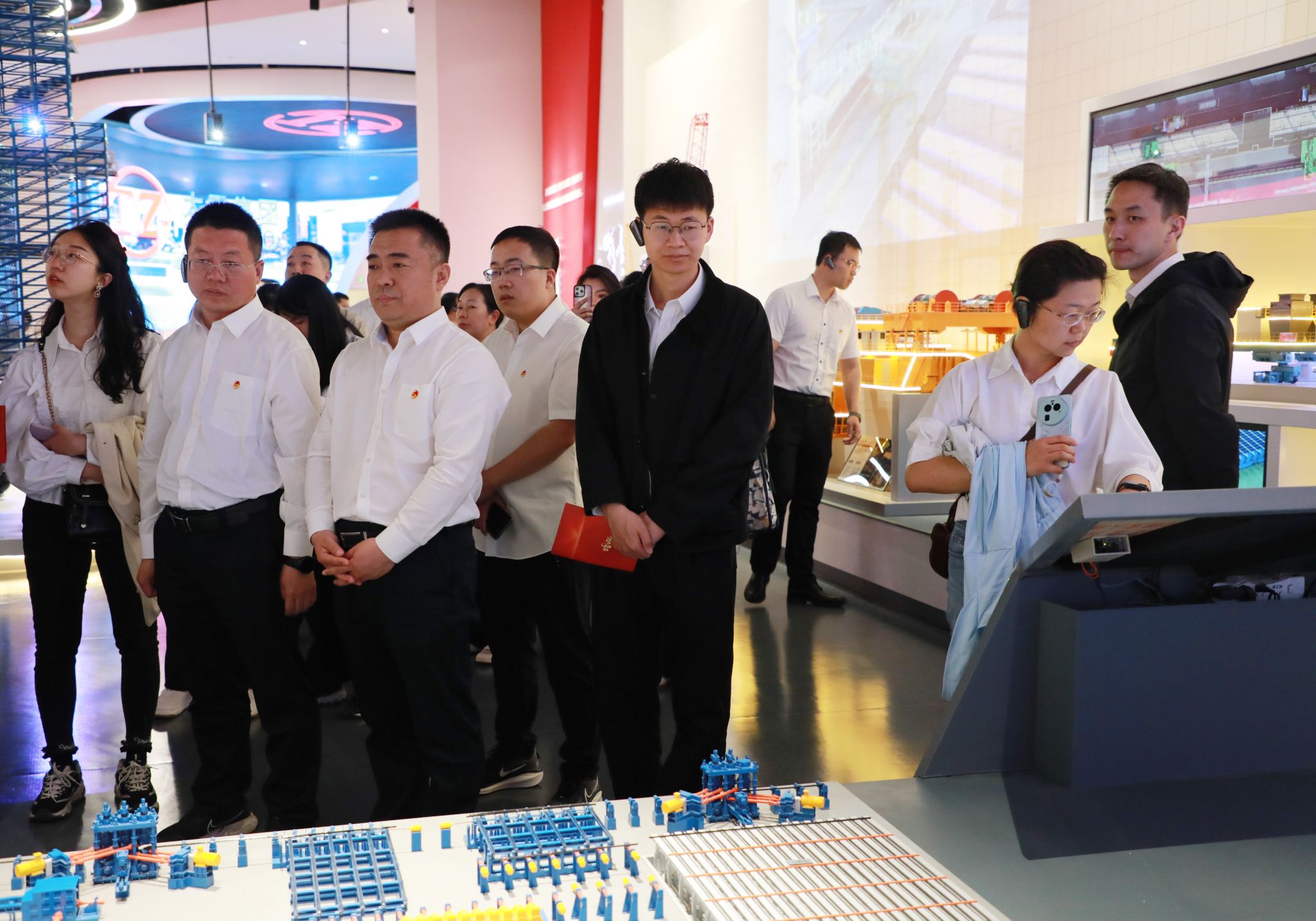 主題研學環(huán)節(jié),團員青年走進太重集團展覽中心,了解太重從創(chuàng)立之初到現(xiàn)在蓬勃發(fā)展的奮斗歷程,并體驗展廳內數(shù)字化的演示設備,感受太重創(chuàng)新活力?!拔覀冏膭榆嚲褪怯玫倪@種車輪呀”“太重生產的裝備是當之無愧的國之重器”“原來設計一臺專屬定制的起重機這么快”……大家邊看邊聽邊討論。