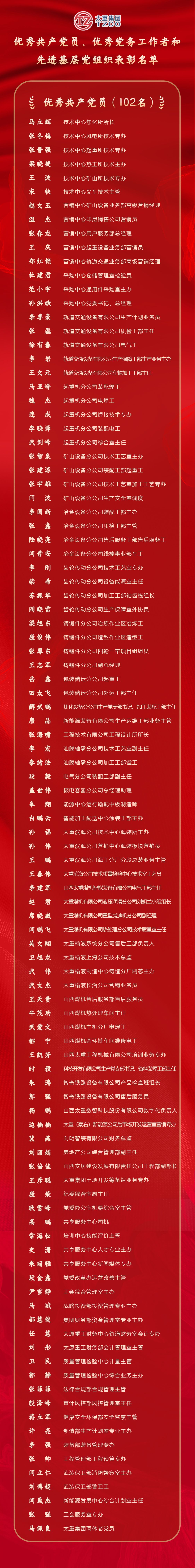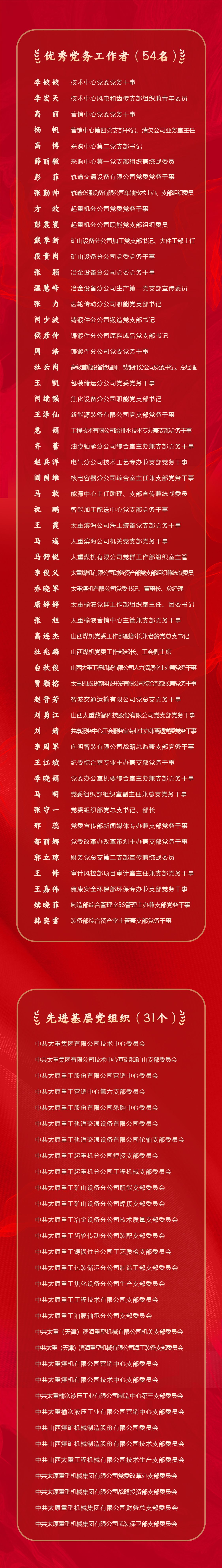 授予宋軼、鄭紅鎖等102名同志“優(yōu)秀共產(chǎn)黨員”稱(chēng)號(hào),授予張勤帥、高博、李宏天等54名同志“優(yōu)秀黨務(wù)工作者”稱(chēng)號(hào),授予中共太原重工油膜軸承分公司支部委員會(huì)、中共太原重型機(jī)械集團(tuán)有限公司財(cái)務(wù)總支部委員會(huì)、中共太重集團(tuán)有限公司技術(shù)中心委員會(huì)等31個(gè)黨組織“先進(jìn)基層黨組織”稱(chēng)號(hào)。