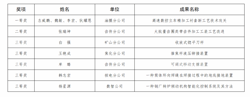 近日,2024年全國(guó)機(jī)械冶金建材行業(yè)職工技術(shù)創(chuàng)新成果獎(jiǎng)?wù)焦?,太重集團(tuán)7項(xiàng)成果獲獎(jiǎng),包括一等獎(jiǎng)1項(xiàng)、二等獎(jiǎng)1項(xiàng)、三等獎(jiǎng)5項(xiàng),再次彰顯了公司近年來(lái)科技創(chuàng)新取得的突出成績(jī)。