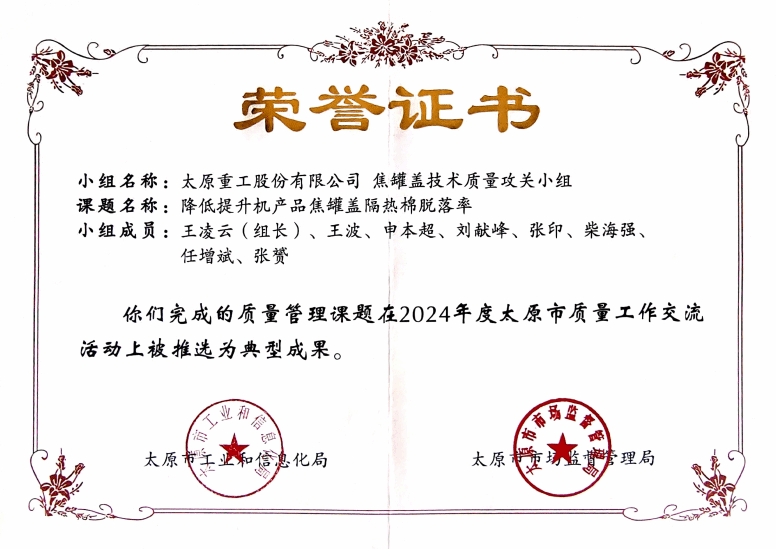 近日,2024年度太原市質量工作交流活動順利舉行,太重冶金分公司售后服務工部獲評“質量信得過班組”,5個QC小組項目均被推選為典型成果。其中“提升板材矯直機現(xiàn)場安裝交檢一次性合格率”“降低提升機產(chǎn)品焦罐蓋隔熱棉脫落率”課題還被推薦參加山西省質量交流活動成果發(fā)布。
