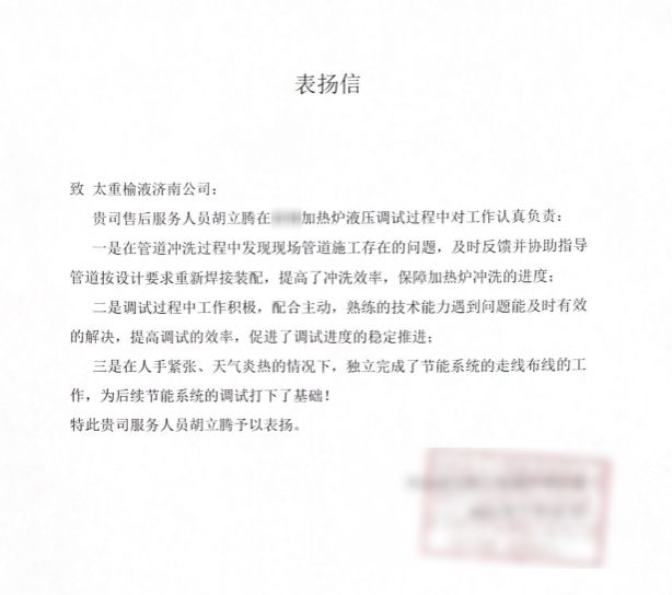 一封表揚(yáng)信,對公司售后服務(wù)人員專業(yè)的技術(shù)、敬業(yè)的精神予以高度贊揚(yáng)。為用戶交付設(shè)備后,安裝調(diào)試工作時間緊、任務(wù)重,公司立即派出經(jīng)驗豐富的售后專員奔赴用戶現(xiàn)場,扎根作業(yè)一線、克服高溫酷暑,幫助用戶完成節(jié)能系統(tǒng)安裝以及電控的布線走線工作,與此同時,還對用戶的管路沖洗方案進(jìn)行優(yōu)化,為用戶提供切實可行的解決方案,提出專業(yè)建議,最大程度保障了用戶利益。