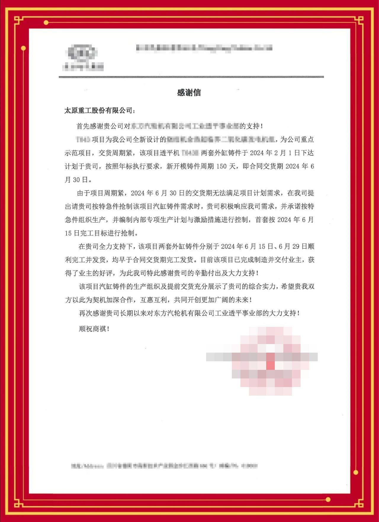 金杯銀杯,不如用戶的口碑!近日,公司收到一封來自四川省某用戶的表揚(yáng)信,信中對(duì)公司積極響應(yīng)用戶需求、高效完成交付任務(wù)給予了高度的肯定和認(rèn)可,不僅鞏固了雙方長(zhǎng)期穩(wěn)定的合作關(guān)系,更為未來的深入合作奠定了堅(jiān)實(shí)基礎(chǔ)。