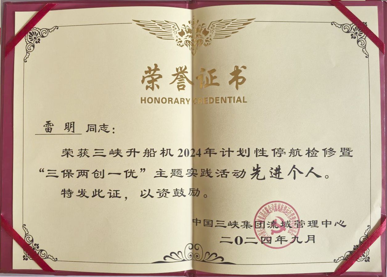 在三峽升船機2024年計劃性停航檢修項目總結大會上,公司服務人員雷明被評為“先進個人”稱號。這是他在2023年獲得用戶表彰后,連續(xù)第二年斬獲此項榮譽!爭分奪秒保工期,不遺余力趕進度。本次檢修是三峽升船機通航以來的第四次停航檢修,為期35天,工期緊、任務重、難度高、風險大,為確保如期完成檢修任務,太重榆液精心組織、周密安排,積極做好人員、檢修工器具、材料及設備設施等各項準備工作,針對本次檢修的重難點制定了切實可行的專項施工方案和安全方案。在施工過程中,公司合理組織調配資源,落實技術細節(jié)要求,圓滿高效地完成了各項檢修任務,質量、安全、進度均達到要求,“太重速度”為我國三峽項目的平穩(wěn)運行再立新功!