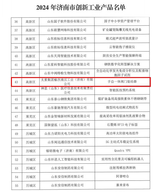 首次參評(píng)收獲豐!近日,濟(jì)南市工業(yè)和信息化局公布了2024年濟(jì)南市創(chuàng)新工業(yè)產(chǎn)品名單,太重榆液自主研發(fā)的“手自一體閥門驅(qū)動(dòng)器”成功入選,以實(shí)際行動(dòng)為太重品牌增亮添色!