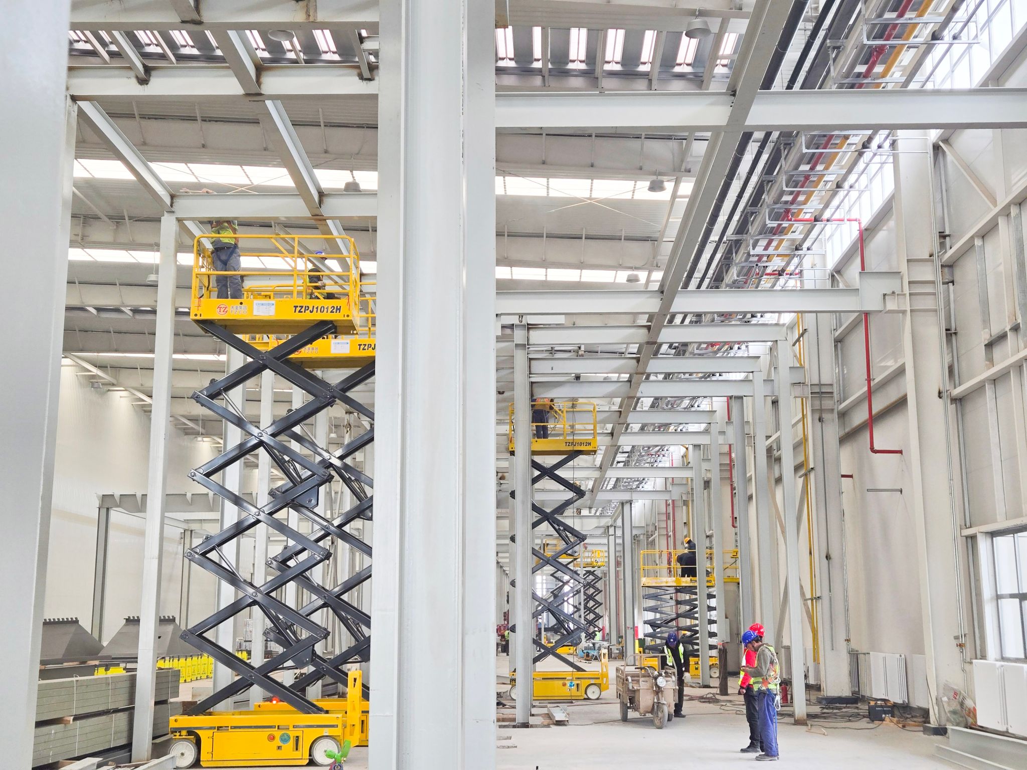 高端產(chǎn)線亮點紛呈,太重裝備在其中忙得“不亦樂乎”。聯(lián)合廠房內(nèi),太重研制的高空作業(yè)平臺隨處可見,隨車起重機更是以其靈活的特性在廠房完善中發(fā)揮著關(guān)鍵作用。一位現(xiàn)場施工人員感慨道:“太重直臂車、剪叉車成為我們的得力幫手,用自己的一流產(chǎn)品,造自己的一流園區(qū),相信園區(qū)建成之后,太重工程起重機產(chǎn)品的性能只會更好!”