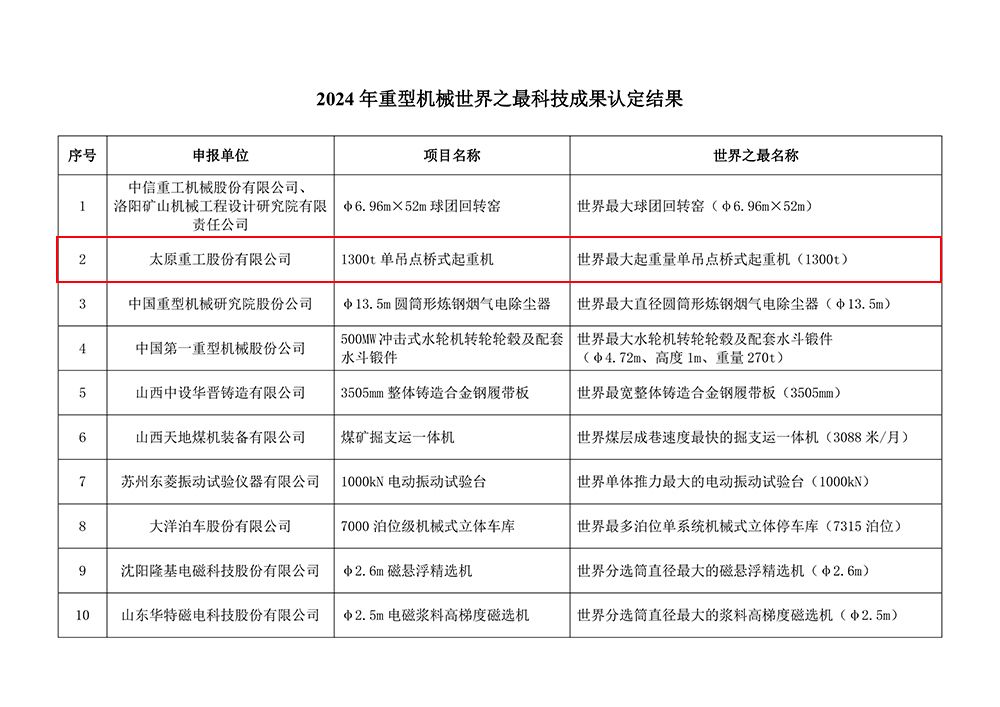 本次“重型機(jī)械世界之最科技成果”認(rèn)定,全國共有10項成果入選,要求項目突破關(guān)鍵技術(shù)壁壘,達(dá)到或超過國際先進(jìn)水平,并至少有一項關(guān)鍵技術(shù)指標(biāo)創(chuàng)造同類產(chǎn)品的世界之最。太重1300t橋式起重機(jī)榮登世界之巔,背后是“共和國長子”深耕起重機(jī)領(lǐng)域數(shù)十年的深厚積淀,也是太重科技工作者矢志創(chuàng)新、重器報國的不懈追求,充分展示了太重在起重機(jī)領(lǐng)域無可爭議的領(lǐng)先地位,也為我國大型起重機(jī)的設(shè)計制造蹚出了一條新路。
