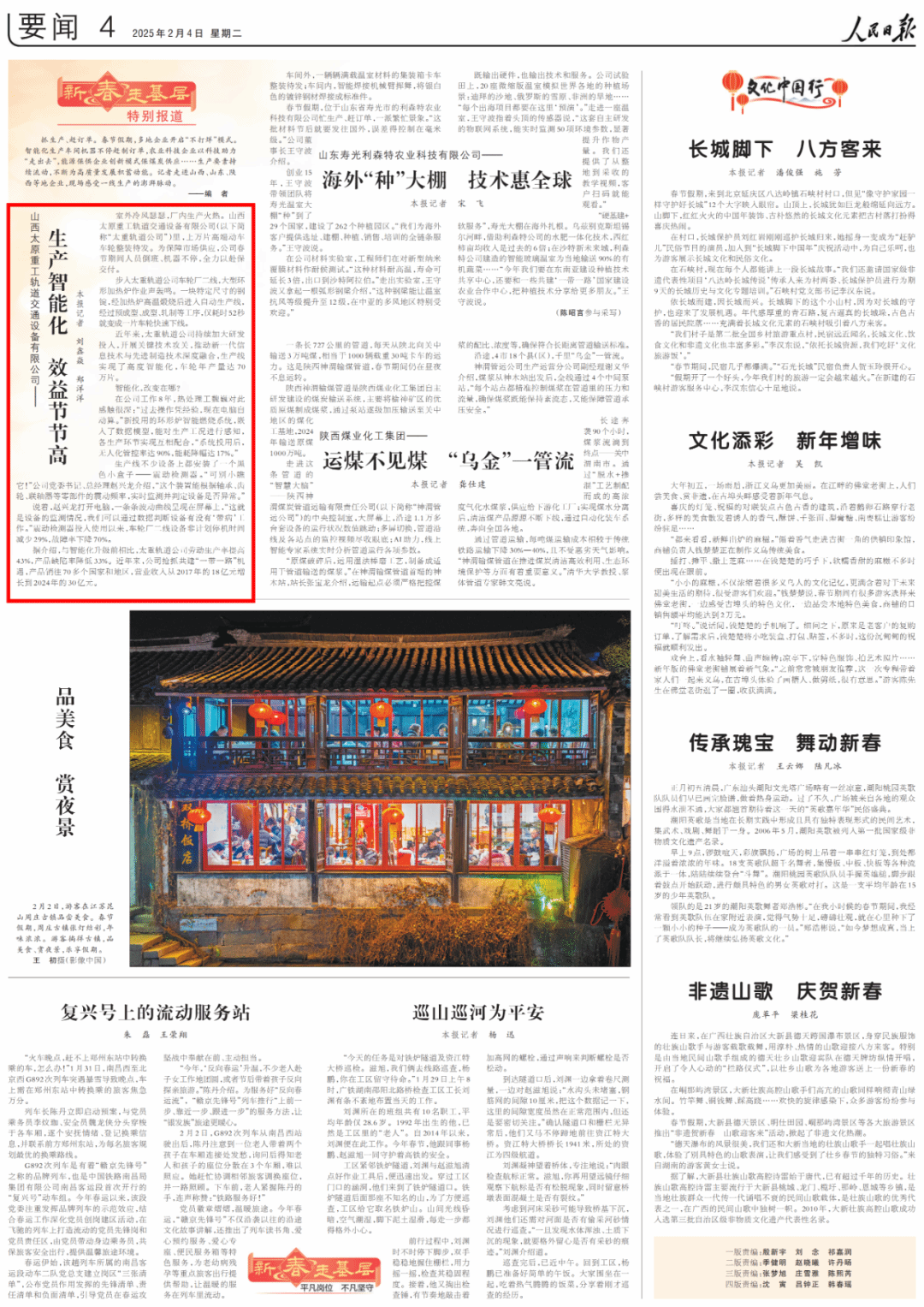 新春伊始,萬象更新,太重以亮眼開局備受矚目,榮登媒體熱榜。生產(chǎn)智能化、效益節(jié)節(jié)高!2月4日,人民日報《新春走基層·特別報道》走進軌道交通行業(yè)首座“燈塔工廠”——太重軌道公司車輪廠二線,感受智能化生產(chǎn)的澎湃脈動。數(shù)據(jù)見證非凡成就:勞動生產(chǎn)率提高43%,產(chǎn)品缺陷率降低33%,營業(yè)收入從2017年的18億元增長到2024年的30億元,清晰勾勒出太重向智能化大步邁進、效益持續(xù)上揚的堅實步伐。2月5日,山西新聞聯(lián)播《節(jié)后上班首日 我省各地奮進“春天里”》欄目也將鏡頭對準太重工程起重機項目建設(shè)現(xiàn)場,工人們忙碌而有序,大型機械轟鳴作響,努力打造高端裝備制造雙鏈雙千億產(chǎn)業(yè)集群,彰顯太重人奮進爭先的蓬勃朝氣與豪邁干勁!春啟新程,開局沖刺!2025,讓我們以奮斗之名,攜手共進,續(xù)寫太重新的輝煌!