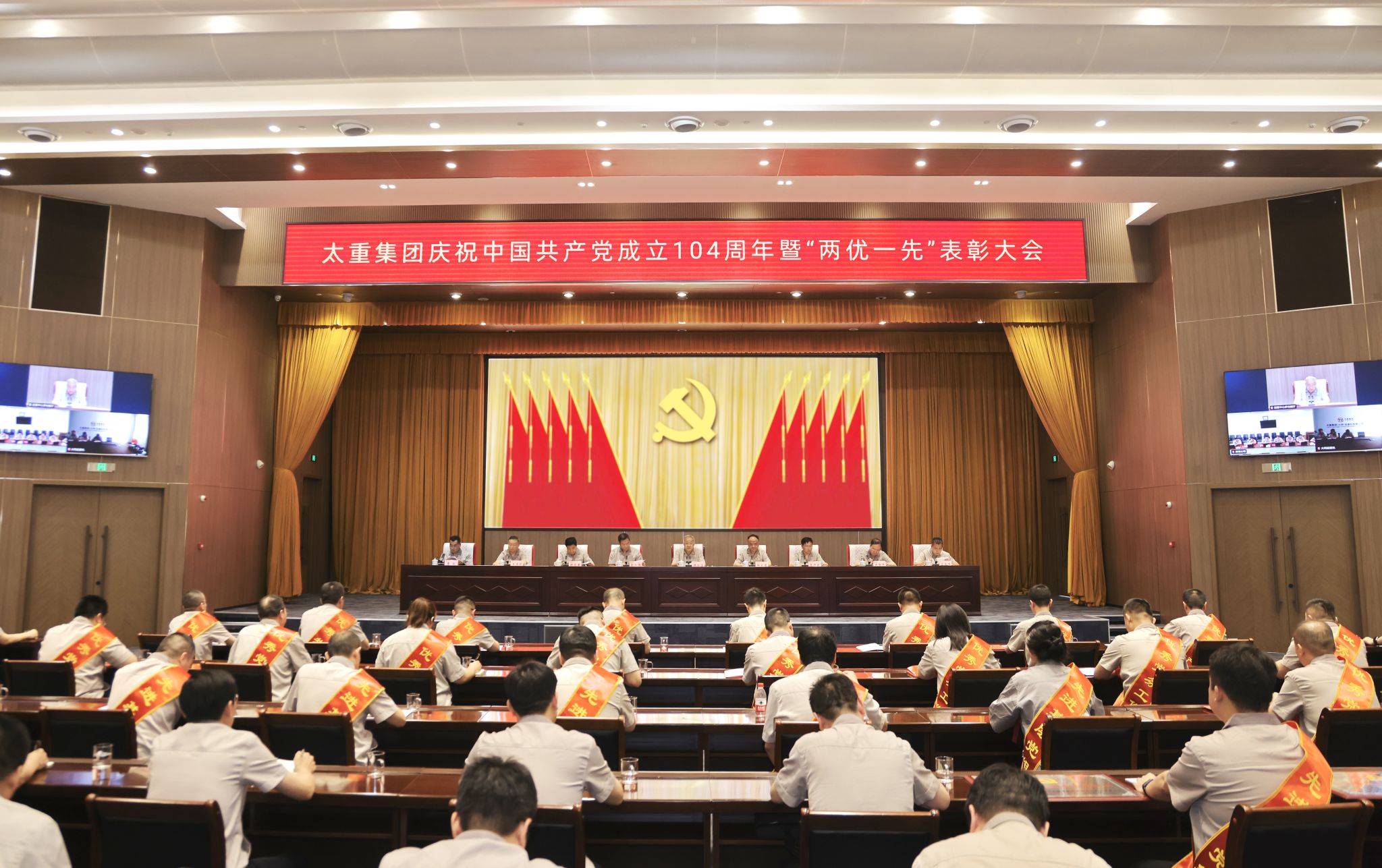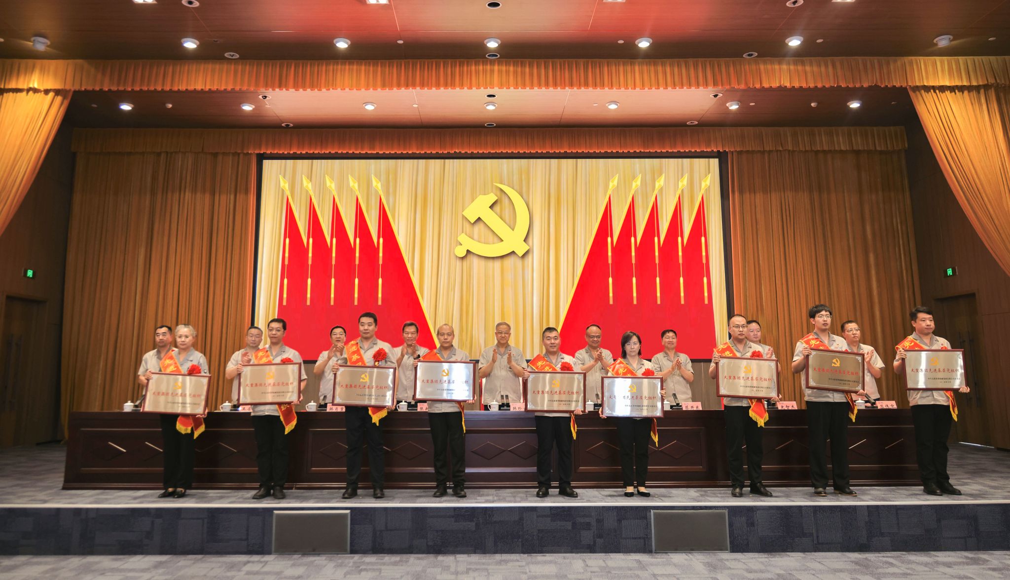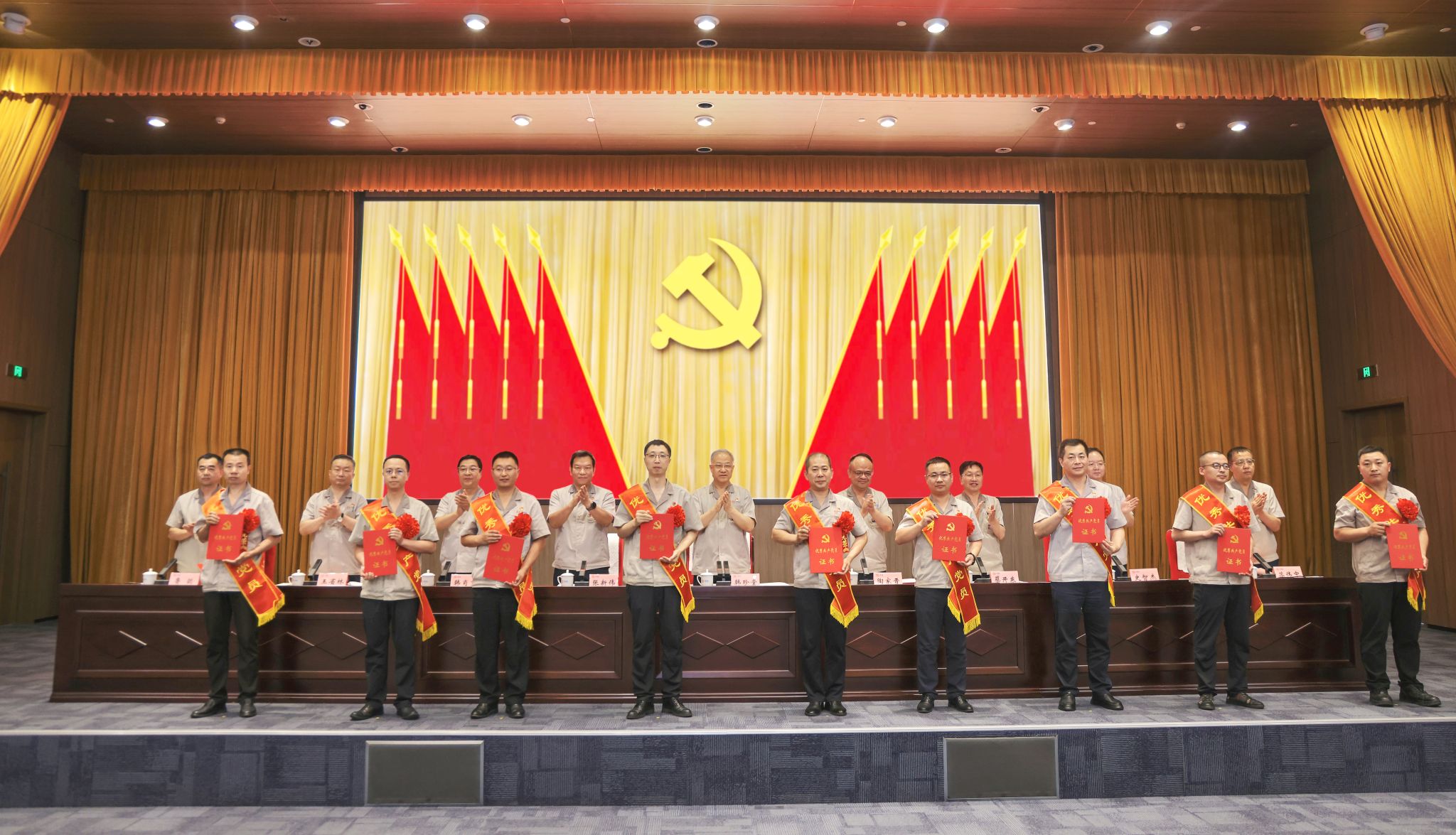 黨徽熠熠生輝,旗幟鮮艷似火,大會在莊嚴(yán)的國歌聲中拉開帷幕。集團(tuán)公司黨委副書記、副董事長、總經(jīng)理陶家晉主持會議。公司黨委專職副書記、副董事長張新偉宣讀集團(tuán)公司黨委《關(guān)于表彰優(yōu)秀共產(chǎn)黨員、優(yōu)秀黨務(wù)工作者和先進(jìn)基層黨組織的決定》?!皟蓛?yōu)一先”代表們身披綬帶、胸佩紅花依次登臺,公司領(lǐng)導(dǎo)為他們頒獎。
