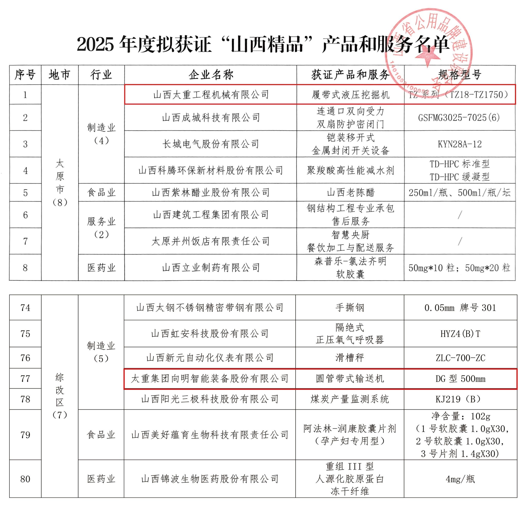 做強“山西精品”,擦亮“山西品牌”。近日,山西省公用品牌建設(shè)聯(lián)合會公布了2025年度擬獲證“山西精品”產(chǎn)品和服務(wù)名單。太重兩款產(chǎn)品——履帶式液壓挖掘機和圓管帶式輸送機憑借過硬實力成功入選。這是繼鑄造起重機、城軌車輪后,太重產(chǎn)品再度獲得該項榮譽。