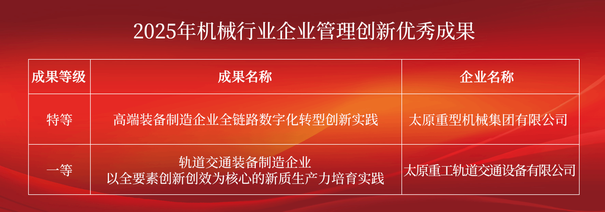 改革之路,創(chuàng)新筑基!近日,中國(guó)機(jī)械行業(yè)企業(yè)管理協(xié)會(huì)正式發(fā)布2025年機(jī)械行業(yè)企業(yè)管理創(chuàng)新優(yōu)秀成果名單,太重兩項(xiàng)成果榮耀上榜,分別獲得特等獎(jiǎng)和一等獎(jiǎng)。