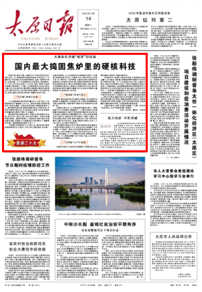 9月14日,太原日?qǐng)?bào)頭版頭條《喜迎二十大》專欄,刊發(fā)文章《太重焦化突破“瓶頸”創(chuàng)效益 國(guó)內(nèi)最大搗固焦?fàn)t里的硬核科技》,報(bào)道太重集團(tuán)聚焦“雙碳”目標(biāo),加快培育能源科技創(chuàng)新領(lǐng)域新路徑,從具備制造國(guó)際先進(jìn)水平焦?fàn)t機(jī)械成套設(shè)備能力,到首開“一鍵煉焦”技術(shù)先河,再到研發(fā)出全國(guó)最大的智能搗固焦?fàn)t設(shè)備,“核心技術(shù)”的自主創(chuàng)新和“卡脖子”問題的逐個(gè)攻破,推動(dòng)了我國(guó)焦化裝備制造在國(guó)際市場(chǎng)上從跟跑、并跑到領(lǐng)跑的跨越。