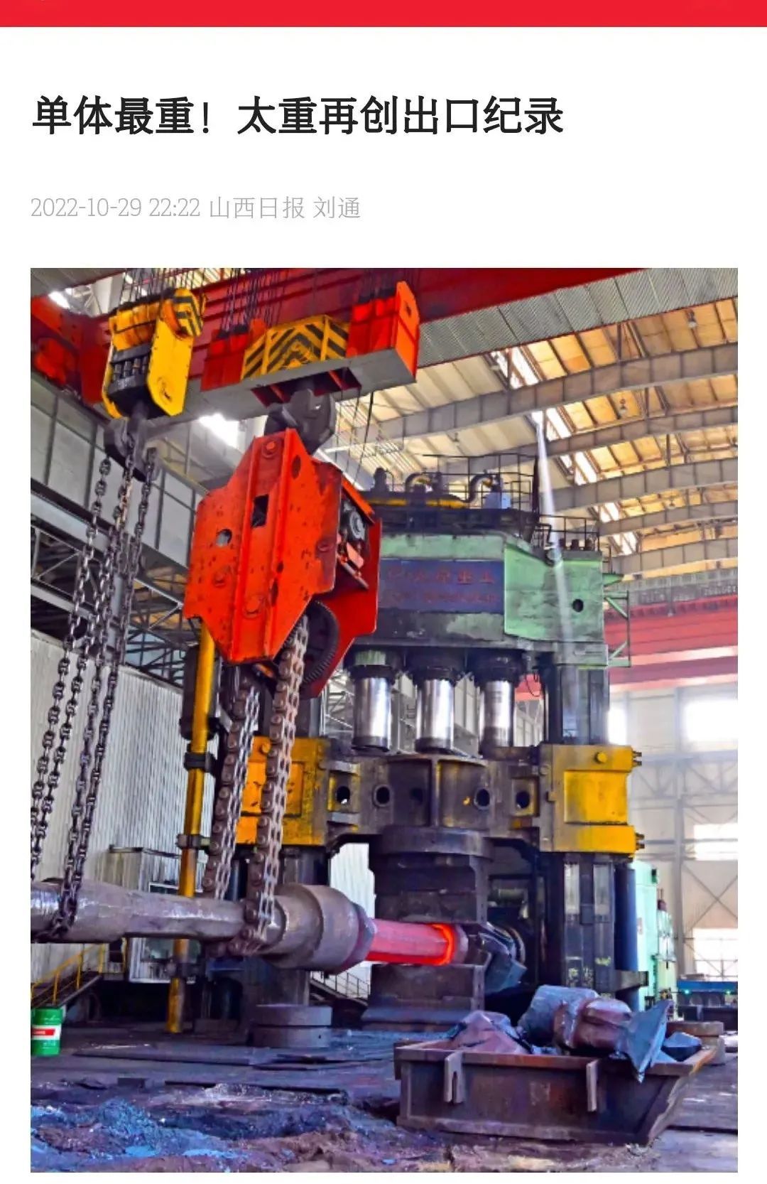 近日,山西日報(bào)以《單體最重!太重再創(chuàng)出口紀(jì)錄》為題,對太重集團(tuán)高端裝備制造領(lǐng)域的新突破進(jìn)行報(bào)道。太重集團(tuán)堅(jiān)持以“精細(xì)化、國際化、高端化、智能化”為方向,以智能制造、科技創(chuàng)新為動(dòng)能,在轉(zhuǎn)型升級(jí)中展現(xiàn)新作為,積極履行好高端裝備制造產(chǎn)業(yè)鏈“鏈主”企業(yè)責(zé)任,持續(xù)加大關(guān)鍵核心技術(shù)攻關(guān)力度,為公司建設(shè)具有國際一流競爭力的現(xiàn)代智能裝備制造企業(yè)蓄勢賦能。