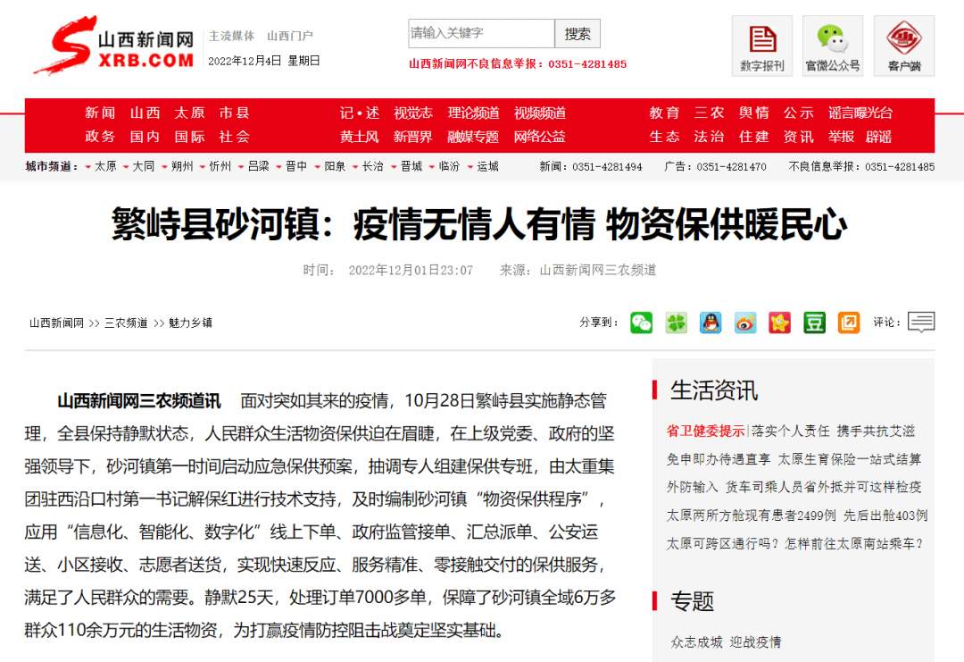 近日,山西新聞網(wǎng)刊發(fā)《繁峙縣砂河鎮(zhèn):疫情無(wú)情人有情 物資保供暖民心》文章,報(bào)道太重集團(tuán)駐村工作隊(duì)面對(duì)疫情嚴(yán)峻形勢(shì),迅速響應(yīng)、積極應(yīng)戰(zhàn),協(xié)助砂河鎮(zhèn)高效快捷完成物資保供任務(wù),用行動(dòng)扛起疫情防控責(zé)任,為打贏疫情防控攻堅(jiān)戰(zhàn)貢獻(xiàn)國(guó)企力量。