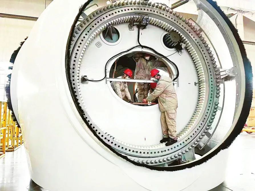 新能源公司風(fēng)電整機(jī)裝配車間內(nèi),裝配工正在進(jìn)行輪轂內(nèi)裝作業(yè)