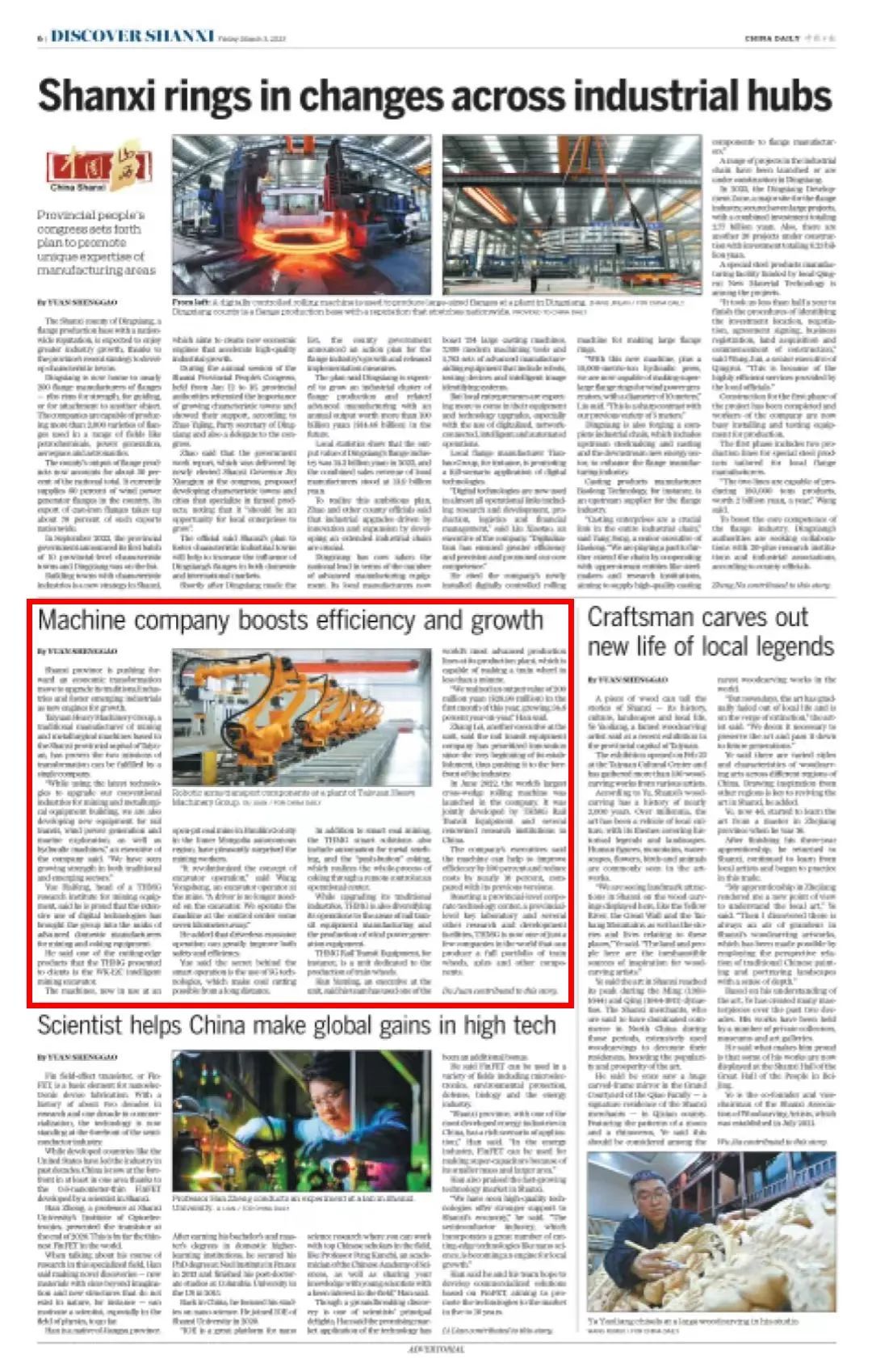 今日,中國日?qǐng)?bào)全英文刊發(fā)《Machine company boosts efficiency and growth》文章,報(bào)道太重集團(tuán)立足公司產(chǎn)業(yè)優(yōu)勢(shì),聚焦智能礦用挖掘機(jī)、軌道交通等領(lǐng)域,推進(jìn)智能設(shè)計(jì)、智能制造、智能產(chǎn)品、智能服務(wù),持續(xù)提升重型裝備制造業(yè)的技術(shù)含量,積極在全省轉(zhuǎn)型發(fā)展中發(fā)揮龍頭帶動(dòng)作用,助力我省建設(shè)中部地區(qū)先進(jìn)制造業(yè)基地和數(shù)字經(jīng)濟(jì)發(fā)展新高地,在不斷推動(dòng)產(chǎn)業(yè)形態(tài)轉(zhuǎn)型升級(jí)中勇立新功。