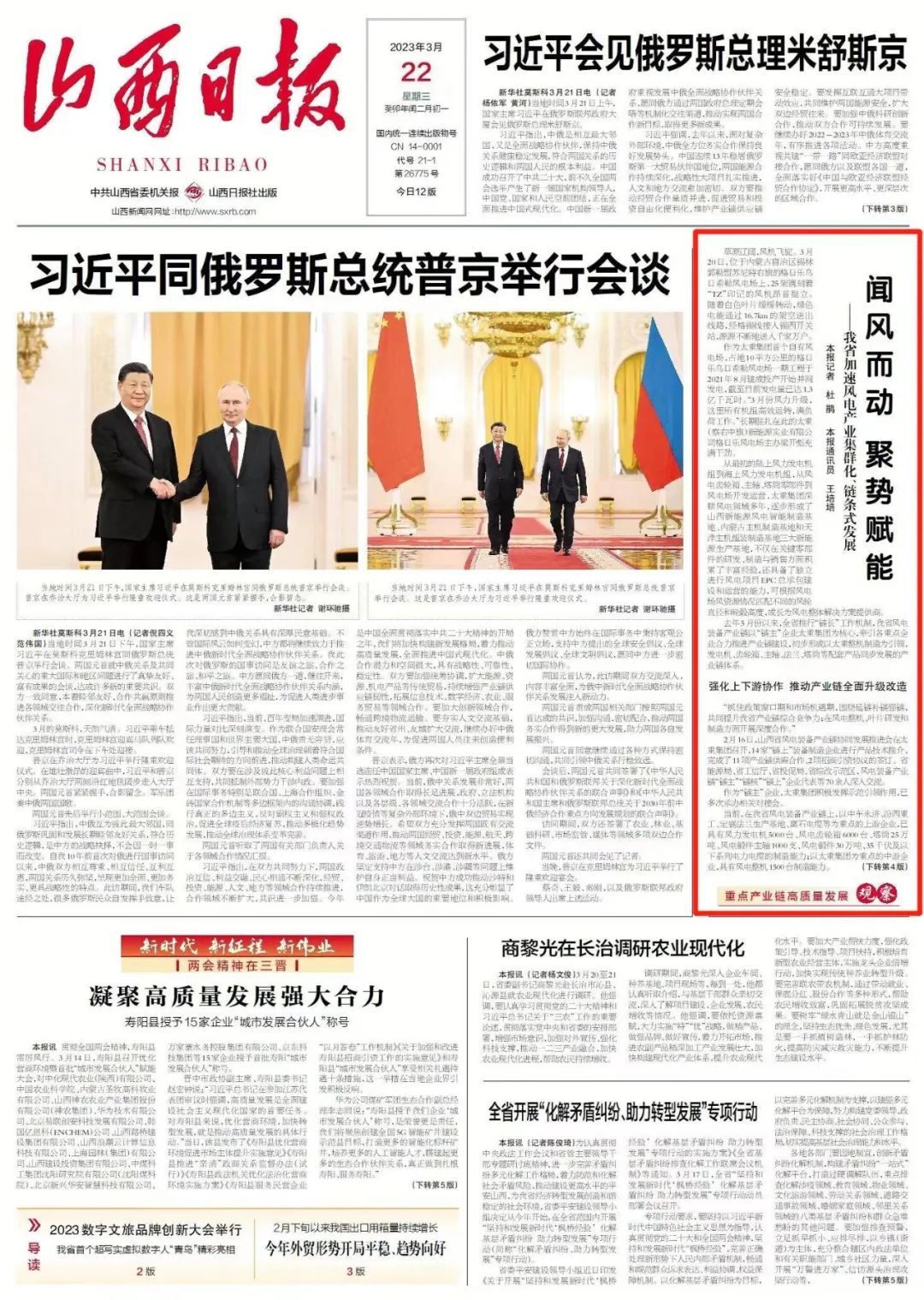 今天,山西日?qǐng)?bào)頭版“重點(diǎn)產(chǎn)業(yè)鏈高質(zhì)量發(fā)展觀察”專欄,以“我省風(fēng)電產(chǎn)業(yè)集群化、鏈條式發(fā)展”為題,報(bào)道了太重集團(tuán)聞風(fēng)而動(dòng)、聚勢(shì)賦能,發(fā)展壯大風(fēng)電產(chǎn)業(yè)鏈、創(chuàng)新鏈、價(jià)值鏈的生動(dòng)實(shí)踐。