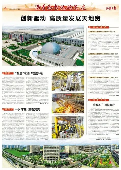 6月24日,山西日?qǐng)?bào)頭版及四版整版多篇報(bào)道紛紛聚焦太重集團(tuán),深入報(bào)道了在習(xí)近平總書記考察調(diào)研太重六年間的巨大變化。太重集團(tuán)在高質(zhì)量發(fā)展的道路上蹄疾步穩(wěn),用實(shí)際行動(dòng)回應(yīng)著領(lǐng)袖的殷殷囑托。作為省內(nèi)唯一“雙鏈主”企業(yè),太重不斷加大科研投入力度,在突破關(guān)鍵核心技術(shù)、促進(jìn)產(chǎn)業(yè)轉(zhuǎn)型升級(jí)的最前沿業(yè)績(jī)突出,蔚然形成千帆奮競(jìng)、全面創(chuàng)新的生動(dòng)局面,受到了主流媒體的關(guān)注。