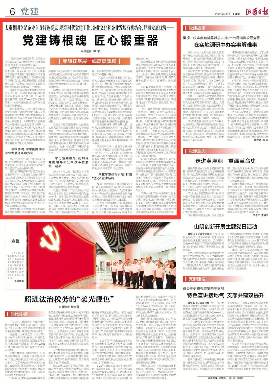 今天,山西日報刊發(fā)《黨建鑄根魂 匠心鍛重器》文章,聚焦太重集團以習近平新時代中國特色社會主義思想為指引,認真學習貫徹黨的二十大精神,充分發(fā)揮黨組織政治核心、政治引領作用,扛起建設先進文化的責任,立足企業(yè)自身特色和亮點,把新時代黨建工作和企業(yè)文化建設有機結合起來,實現(xiàn)高質量高速度發(fā)展,向著建設具有國際一流競爭力的現(xiàn)代智能裝備制造企業(yè)目標闊步邁進。