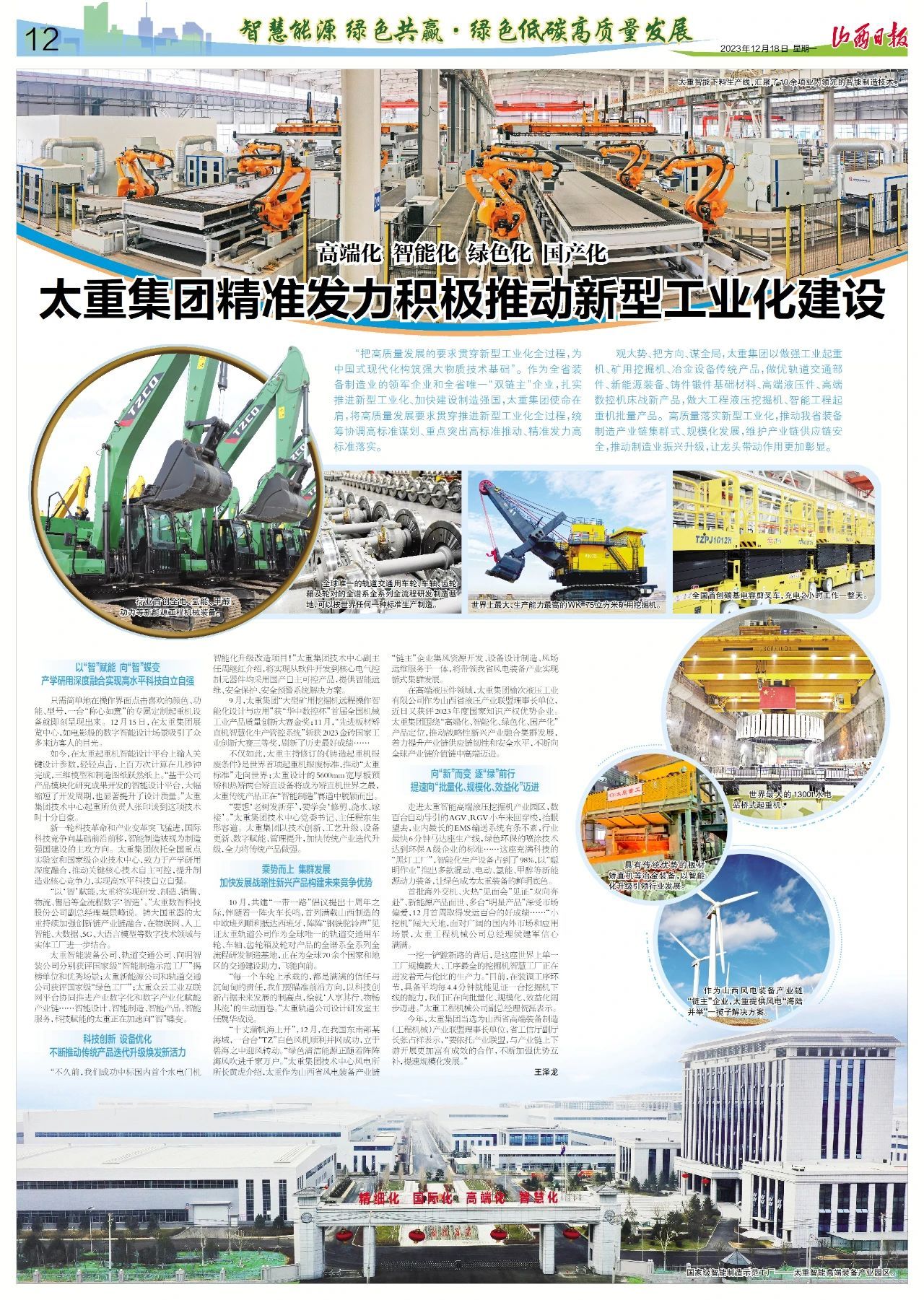今日,山西日報整版刊發(fā)《高端化 智能化 綠色化 國產(chǎn)化 太重集團精準發(fā)力積極推動新型工業(yè)化建設(shè)》文章,從產(chǎn)學研用深度融合、傳統(tǒng)產(chǎn)品迭代升級、加快發(fā)展戰(zhàn)略性新興產(chǎn)品、打造綠色批量裝備等方面,詳細報道太重高質(zhì)量落實新型工業(yè)化的生動實踐,講述公司作為全省唯一“雙鏈主”企業(yè),持續(xù)推動我省裝備制造產(chǎn)業(yè)鏈集群式、規(guī)?;l(fā)展的務實之舉。