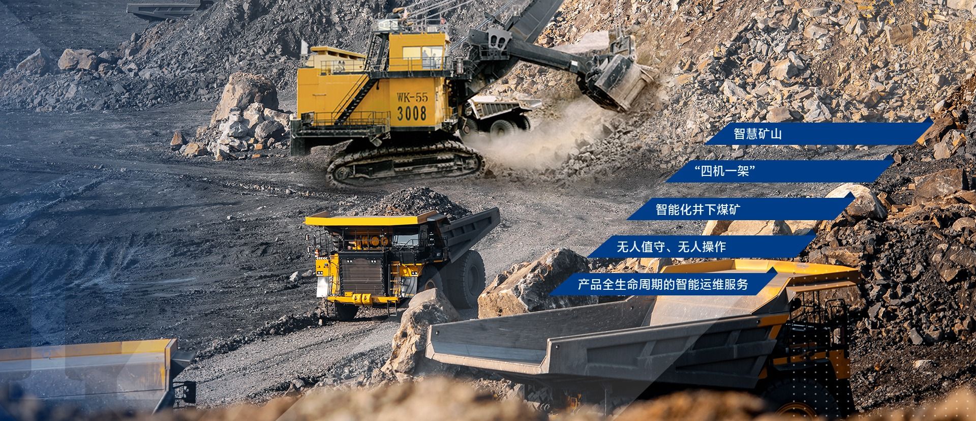公司可為露天礦用戶提供開采、破碎、運(yùn)輸?shù)瘸商坠に囋O(shè)備及“一攬子”解決方案,為井工礦用戶提供“四機(jī)一架”5G智能綜采成套設(shè)備。致力于打造智慧礦山、智能化井下煤礦,實(shí)現(xiàn)露天和井工開采的無人值守、無人操作以及產(chǎn)品全生命周期的智能運(yùn)維服務(wù)。