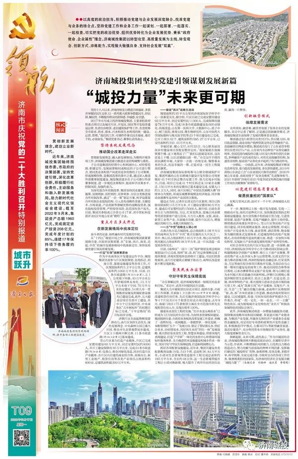 近年來(lái),濟(jì)南城投集團(tuán)始終圍繞市委、市政府的決策部署,堅(jiān)持黨建引領(lǐng),深化改革創(chuàng)新,積極履行社會(huì)責(zé)任,主動(dòng)服務(wù)和融入新發(fā)展格局,助力新時(shí)代社會(huì)主義現(xiàn)代化強(qiáng)省會(huì)建設(shè)。截至2022年9月末,集團(tuán)資產(chǎn)總額1960億元,完成固定資產(chǎn)投資208億元,完成年度計(jì)劃的85%,連續(xù)17年保持項(xiàng)下債務(wù)履約率100%。