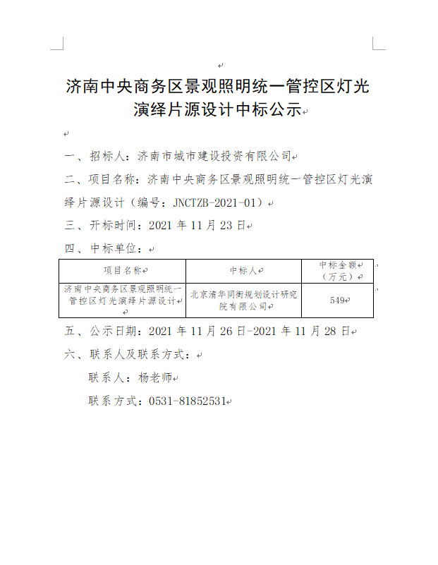 濟南中央商務(wù)區(qū)景觀照明統(tǒng)一管控區(qū)燈光演繹片源設(shè)計中標公示