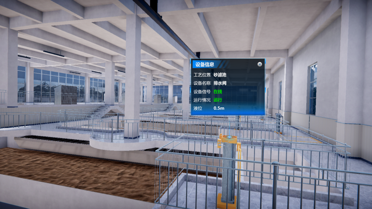 在起步區(qū)水廠數(shù)字化中心,三維數(shù)字化全景把“實體空間”和“虛擬呈現(xiàn)”完美地融合在了一起。通過傳感器采集“實體空間”生產(chǎn)制造過程中的所有實時數(shù)據(jù),能直觀掌握相關(guān)設(shè)備儀器的工作狀態(tài),以三維可視化的形式同步觀察、檢測工藝流程上每臺被檢設(shè)備所處的狀態(tài)。系統(tǒng)還可以任意選取虛擬場景中的相關(guān)物品,對其屬性、狀態(tài)、行為等參數(shù)進(jìn)行查看,促進(jìn)廠區(qū)高效運行。
