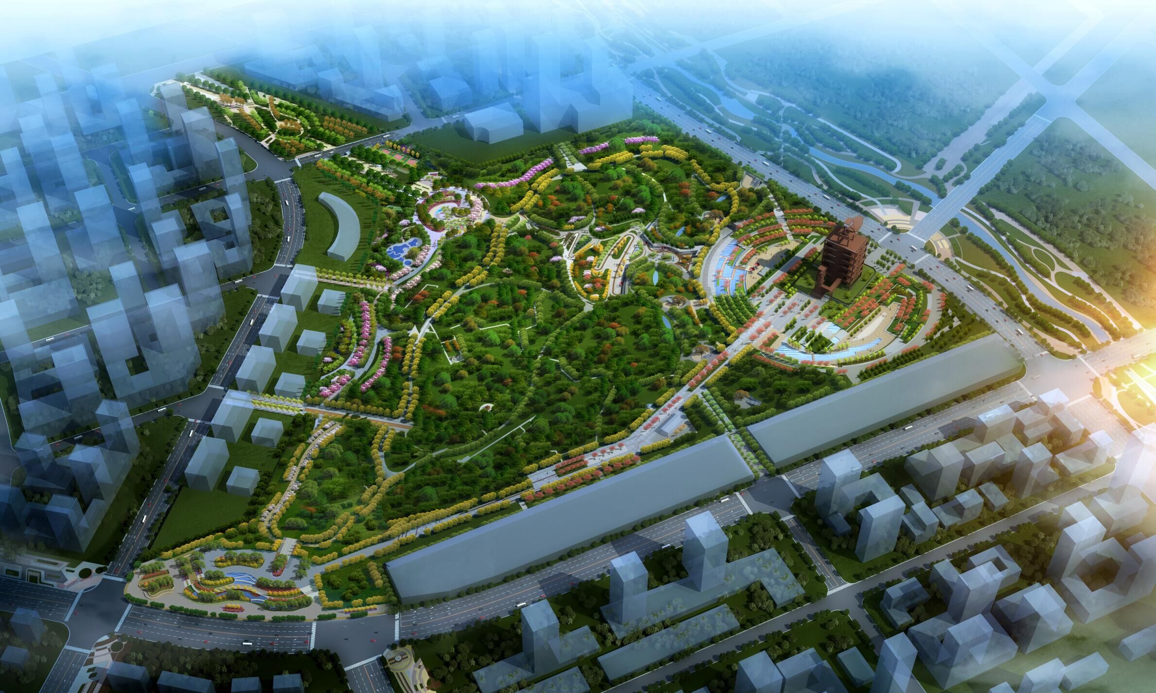 片區(qū)堅(jiān)持生態(tài)優(yōu)先、綠色發(fā)展的理念,先行啟動(dòng)中央森林公園、森林公園地下商業(yè)、韓倉(cāng)河生態(tài)景觀帶綜合整治等項(xiàng)目的建設(shè)。其中森林公園占地面積約 680 畝,綠地率高達(dá) 86%,為濟(jì)南“東強(qiáng)”區(qū)域的綠肺;韓倉(cāng)河生態(tài)景觀綜合整治項(xiàng)目融合生態(tài)防護(hù)、休閑游賞功能于一體,形成東部新城獨(dú)特的生態(tài)景觀。片區(qū)還將對(duì)濟(jì)鋼大門、3200 高爐等進(jìn)行保留改造,形成新舊建筑形態(tài)的碰撞與融合,引領(lǐng)城市的更新和多元化發(fā)展。